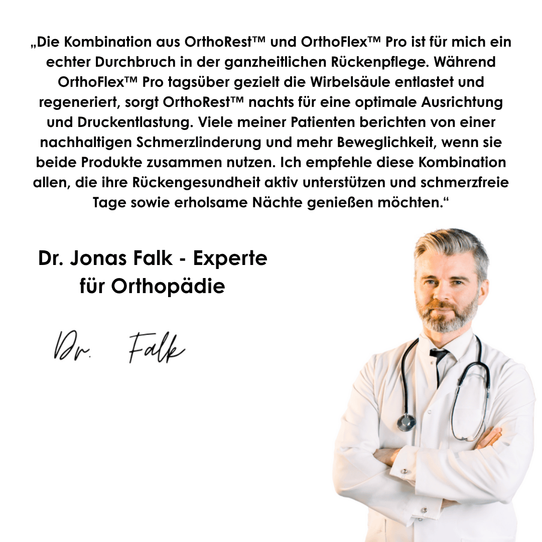 Wenn du bereits tagsüber das Dr. Vitalex Orthoflex™ Pro für gezielte Rückentherapie nutzt, ist das OrthoRest™ Beinkissen die ideale Ergänzung für die Nacht. Es sorgt dafür, dass deine Wirbelsäule auch im Schlaf optimal ausgerichtet bleibt und beugt so erneuten Rückenschmerzen effektiv vor – für nachhaltige Linderung rund um die Uhr.
